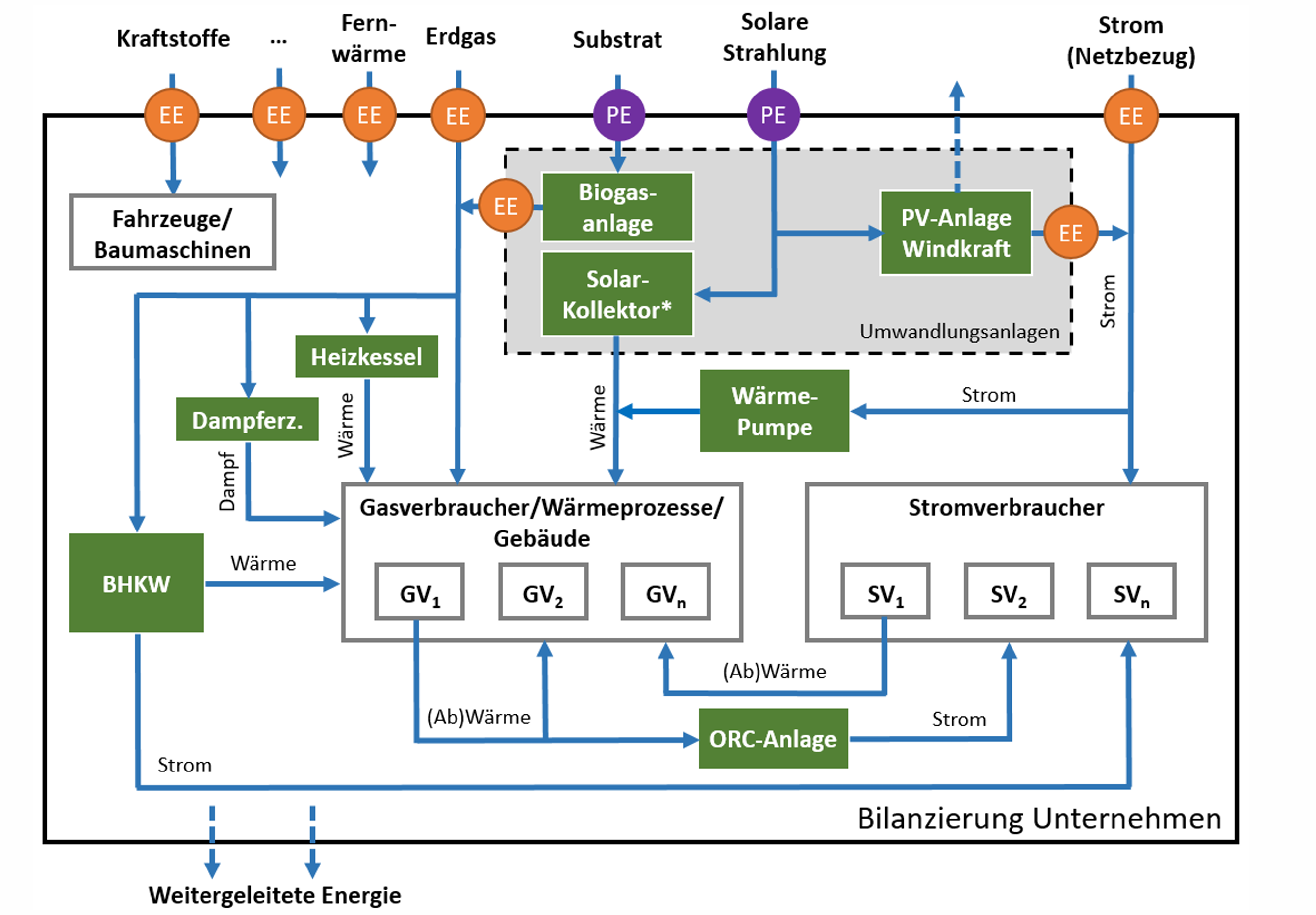 Berücksichtigt werden alle verbrauchten Energiemengen wie Strom, Gas, Kraftstoffe, Fernwärme etc., die innerhalb des Unternehmens genutzt werden. Auch selbst erzeugte Energie zählt – ausgenommen sind Umgebungswärme,-kälte und Solarthermie. Weitergeleitete Energie an Dritte wird abgezogen.